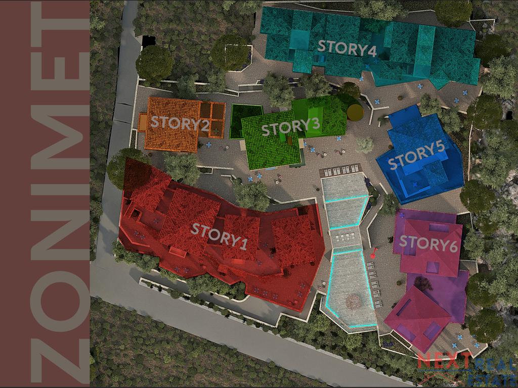 Si trova sul fianco della collina con un dislivello di 15 metri che scende alla spiaggia con cortili a gradoni che comprendono anche aree ricreative, piscine invernali ed estive, idromassaggio, ecc., mentre le unità abitative sono costituite da estesi terrazzi e balconi, ampliandosi vita pubblica a tutti i livelli. La costruzione è caratterizzata dalla massima qualità e rispettosa dell'ambiente!